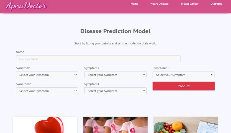 - • End to end Web Application for Disease Prediction based on the various Symptoms using various Machine Learning Algorithms based on the Kaggle Datasets. Also, having a Proper Individual assigned model for Heart Disease Prediction, Diabetes Prediction and Breast Cancer Prediction.